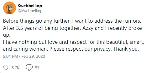 Their relationship hit a bump in early 2020. AzzyLand's then-boyfriend took it to his Twitter handle and shared with his fans that their relationship was over.