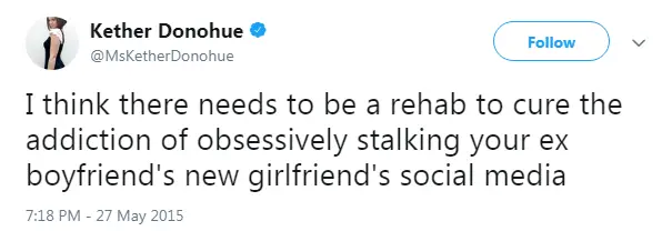 Back in March 2015, she tweeted that there needs to be a rehab to cure the addiction of stalking the ex-boyfriend's new girlfriend in the social media.